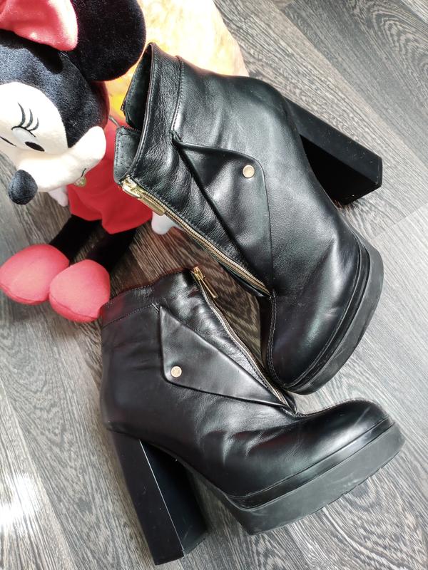 шкіряні демосезонні ботінки б/у, чорного кольору з золотими замочками, збоку є робочий замочок, високий каблук