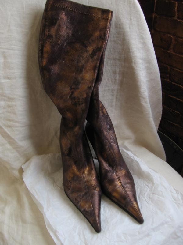 Жіночі чоботи ("чулки") у відмінному стані бренду Donnaflo, Італія. Розмір 37, висота каблука 9 см. Висота чобіт - 35 см (без врахування каблука), ширина у найширшому місці зверху (по нозі) - 30 см - тягнеться скільки потрібно. Матеріал верху - текстиль (стрейч). Всередині устілка - натуральна шкіра. Колір - шоколадно-бронзово-золотистий з гарним блиском. Обміну та повернення немає. Додаткова інформація 0.5.0.4.3.5.0.5.9.3