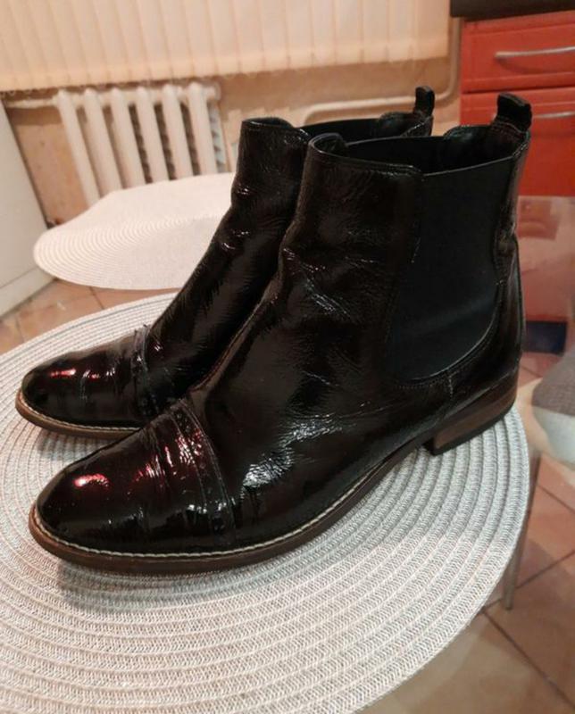 Ботинки челси Челси кожа лак, черного цвета, перферация носок и пятка, резинка бок.Низкий каблучок. Есть незначительные потертости, но они мало заметны. Очень удобные и красивые. По стельке 24.5см.