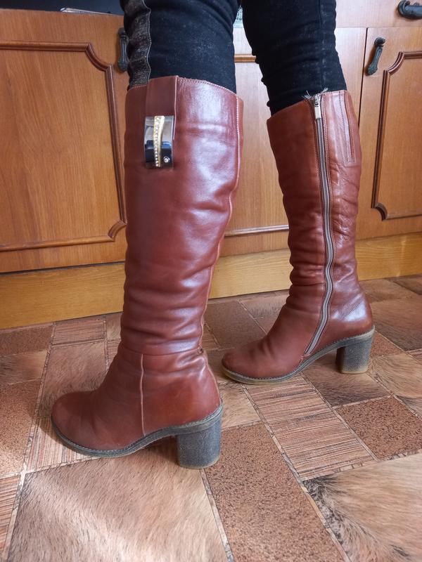 Сапоги жіночі, 38р, рижого кольору, натуральна шкіра, всередині натуральна овчина. Висота каблука 6см, висота підошви 1см. Підошва поліоретан. Польські. Стан хороший.