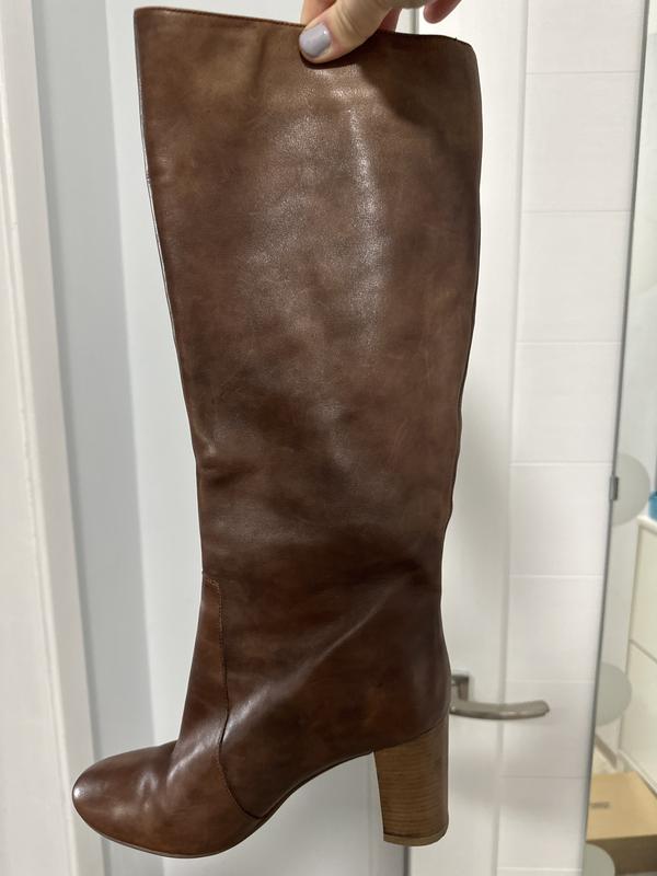 Шкіряні чоботи демі, шкіра зовні і всередині, зручна колодка. Повноцінний 41. Об'єм в литці 43, висота підборів 7 см. В середені на двох чоботах є потертість. Ззовні не видно.