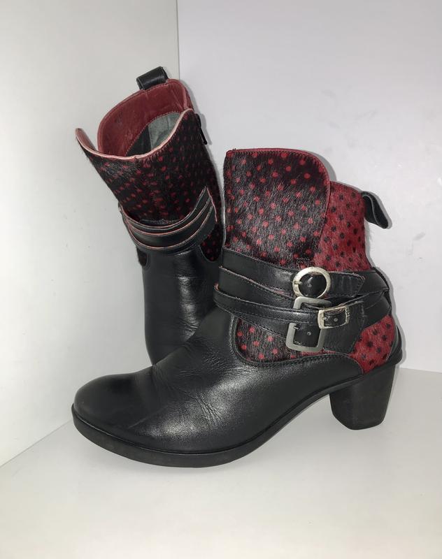 Оригінальна модель від німецького бренду Think! Взуття виготовлене з натуральної шкіри та хутра зверху. Модель оздоблена декоративними швами та елементами у вигляді ремінців. Для зручного одягання є застібка блискавка та петля. Внутрішня частина з шкіри та текстилю. Взуття має невеликі підбори. Підошва міцна, зручна та комфортна. Устілка ортопедична виймається. Черевики підійдуть для щоденного носіння та прогулянок, за допомогою яких ви можете створити багато модних образів. Довжина устілки: 24 см.; Ширина підошви: 9 см.; Висота підборів: 5 см.; Висота черевика з урахуванням підборів: 19 см. Дивіться інші наші оголошення.