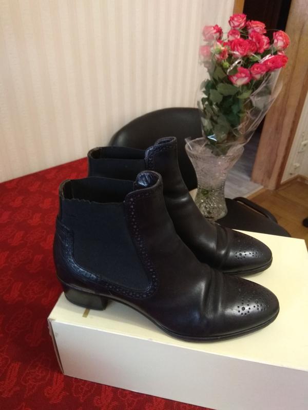 Ботинки кожаные черного цвета на невысоком устойчивом каблучке 4см.На носках и по всему периметру красивое оформление кожи.Резинка для любой полноты ножки.Стелька 26 см.