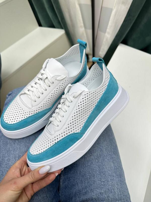 Белые с бирюзовым кеды кроссовки с перфорацией натуральная кожа и замша