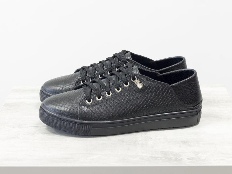 Кеды с мягким задником из дорогой текстурированной кожи черного цвета "питон" на прорезиненной черной подошве 36-41