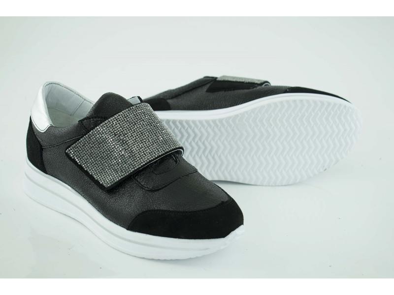 Стильные женские кроссовки бренда Кадар. Обувь выполнена из натуральной кожи, выделяется замшевой вставкой на носке и блестками на застежке. Очень стильно и красиво смотрится на ноге.