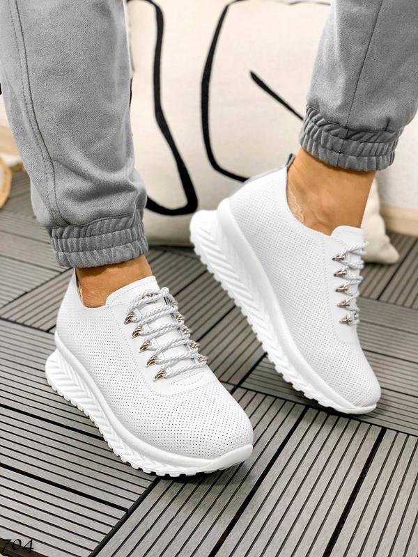 Код 704 Кросівки, Колір білий, матеріал: НАТУРАЛЬНА ШКІРА всередині: Шкіра підклад перфорація не наскрізна підошва ззаду 5 см спереду 2,5 см з 36 по 41 розмір у розмір 36=23,5 см 37=24 см 38=24,5 см 39=25,5 см 40=26 см 41=26,5 см