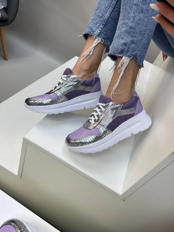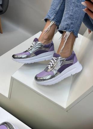 Лавандовые сиреневые с серебристым кожаные кроссовки цвет на выбор