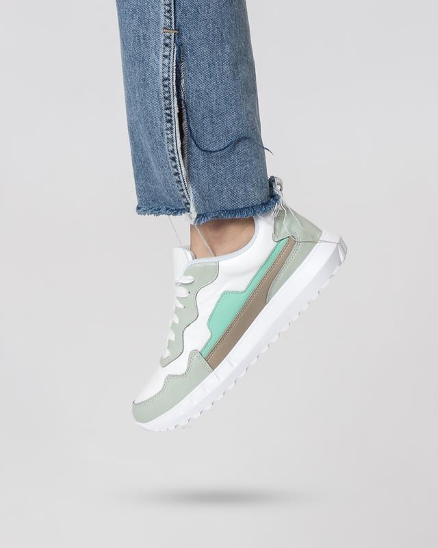 Кроссовки кожаные молодежные зеленые, на стильной белой ровной подошве и высокой платформе...