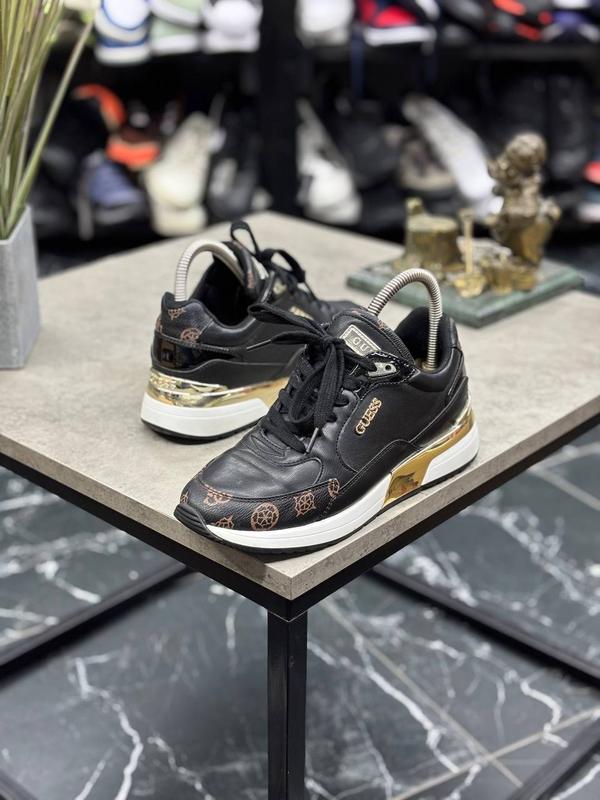 Жіночі кросівки guess moxea в чорному кольорі з фірмовим принтом та золотистими акцентами.