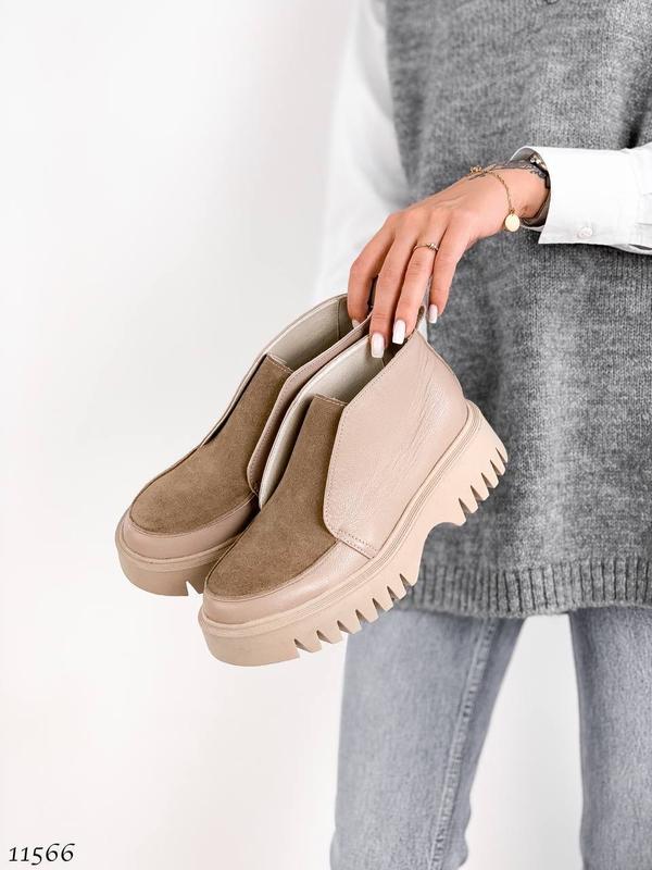Демісезонні лофери колір: бежевий матеріал: натуральна шкіра та замша всередині: шкірпідклад, висота від п'яти 7,5 см, підошва: cпереду 3,5 см, позаду 5 см, на вузьку та середню ніжку 36= 23 см 37= 24 см 38= 24,5 см 39= 25 см 40= 25,5 см Виробництво України