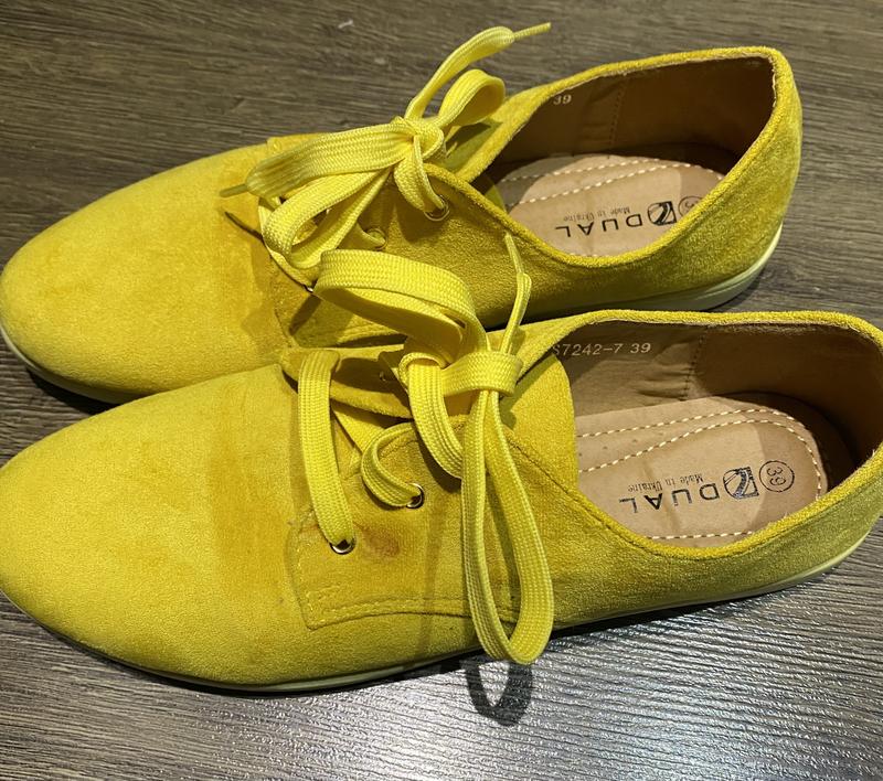 Нові, куплені в інтернеті, не підходять на широку ногу. Матеріал-штучна замша, колір яскравий насичений жовтий. Нюанс-біля шнуровки пляма від клею, на фото показала.