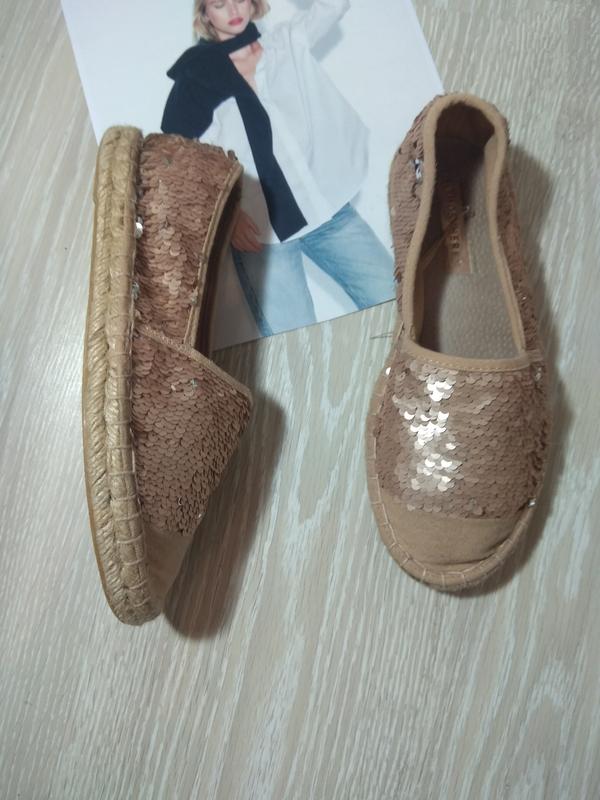 Эспадрильи atmosphere 38 р. стелька 24,2 см., задник предусмотрен мягкий, поэтому советуем брать на ногу 24-24,5 см (не с запасом), 38 на 38. стельки кожаная. Снаружи обшиты бежевыми пайетками. По подошве 25 см. состояние идеальное (5)
