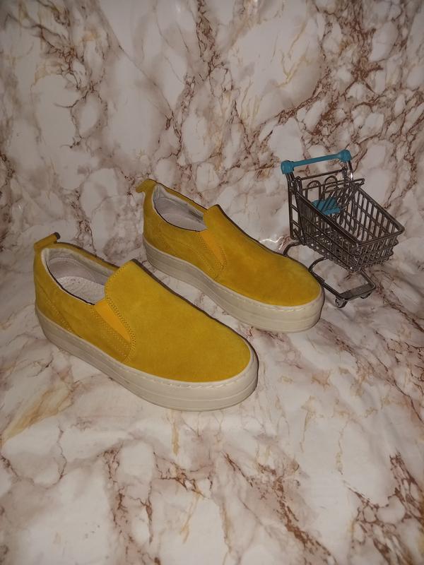 Желтые замшевые мокасины на плотной подошве. Размер-37, стелька-24см. Есть малозаметные следы ношения.