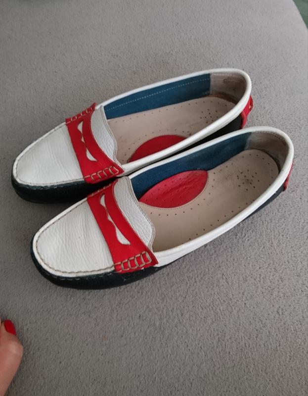 Мягкие, трехцветные, полностью кожаные мокасины пр - ва Турции, 6а мягкой нескользящей подошве. 39 размер, 25 см по стельке, в целом состояние отличное, задники целые. Есть один незаметный заводской нюанс - на одном мокасине небольшое пятнышко ( типа непрокрасилась кожа). Видно только при близком рассмотрении. В цене учтено. На ногу средней полноты. Покупались в Оушен Плазе, в магазине Stefani.