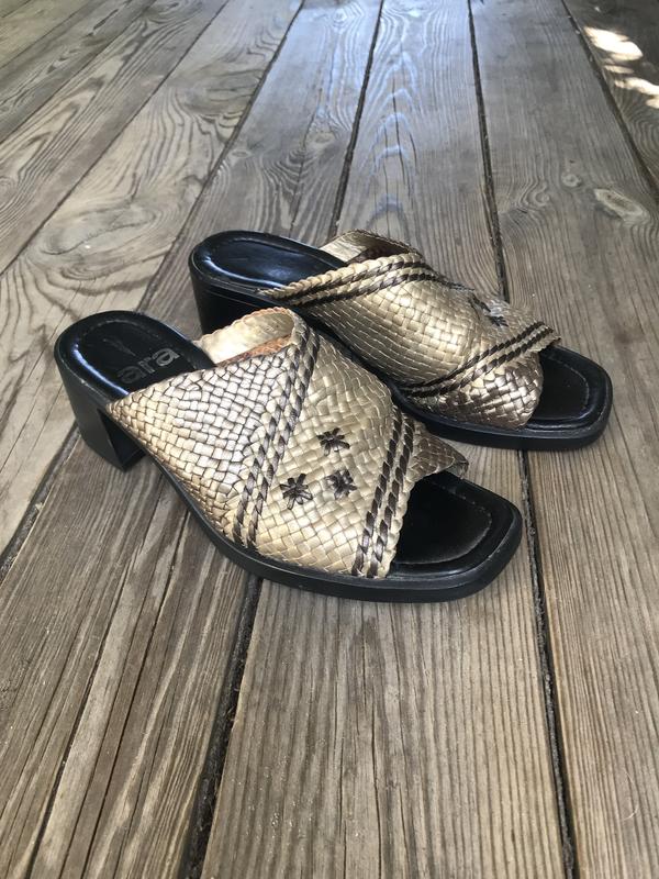 Очень мягкие и удобные сабо на устойчивом широком каблучке 5 см. Плетёная мягкая кожа , подошва нестираемая. Размер-5, длина по стельке-24,5 см. Отличное состояние, но есть на левой полупаре в области пятки незначительная потёртость(см. Последнее фото). В целом-все Ок!
