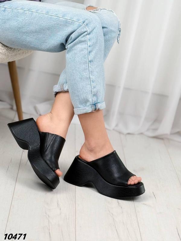 Код 10471 Шлепки Материал натуральная кожа(Китай) Подкладка натуральная кожа Материал подошвы ПВХ Цвет черный Очень легкие и удобные Высота подошвы спереди 3см Высота позади 9 см 🛒Размер по сетке: 38 - 24.5 см