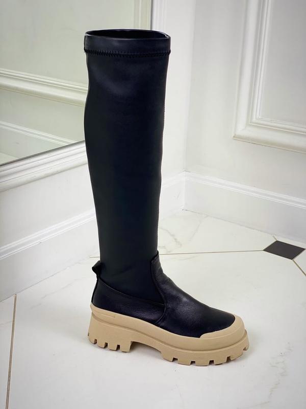 Нова модель у наявності та доступна до замовлення ☺️ Код 10041 (байка) Код 10041-1 (хутро - єврозима) Стильні чоботи Katrin. Натуральна шкіра. Підошва спереду 2см, позаду 4см. Обхват голені 36-40 см, добре тягнеться. Висота від п'яти 44 см. Розмірний ряд: 36-40 Колір: чорний на підошві біж. Зроблено в Україні. Байка: 2500 грн Хутро: 2600 грн