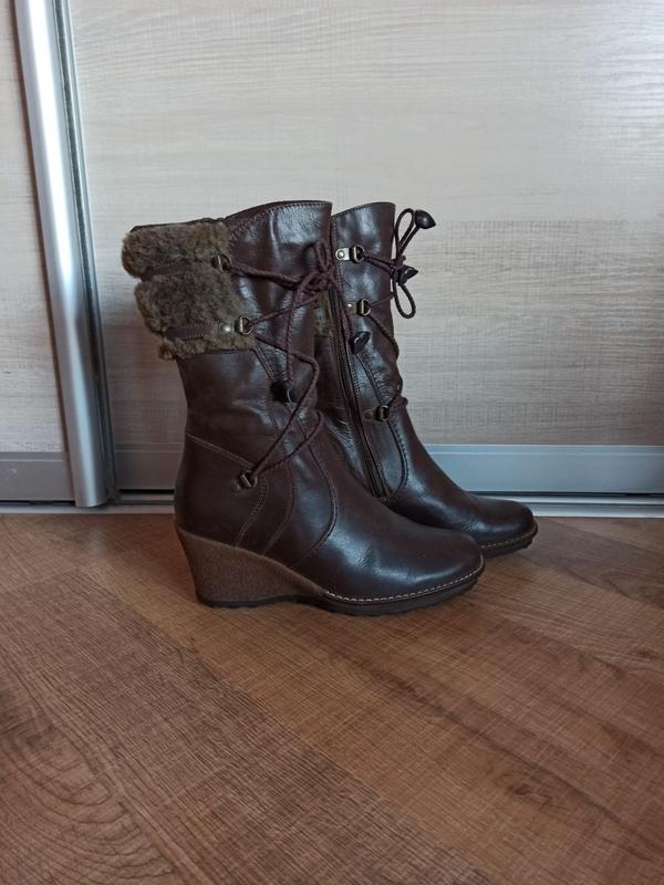 Сапожки з натуральної шкіри. Всередині вовна. Будуть дуже-дуже теплі. Підошва поліуританова - не пропуская холод. Виробник -Україна. Купувала цього виробника вже багато пар взуття - все якісне і носиться дуже довго. Розмір 36, не на дуже широку ніжку. Якість виробу дуже хороша!!!!