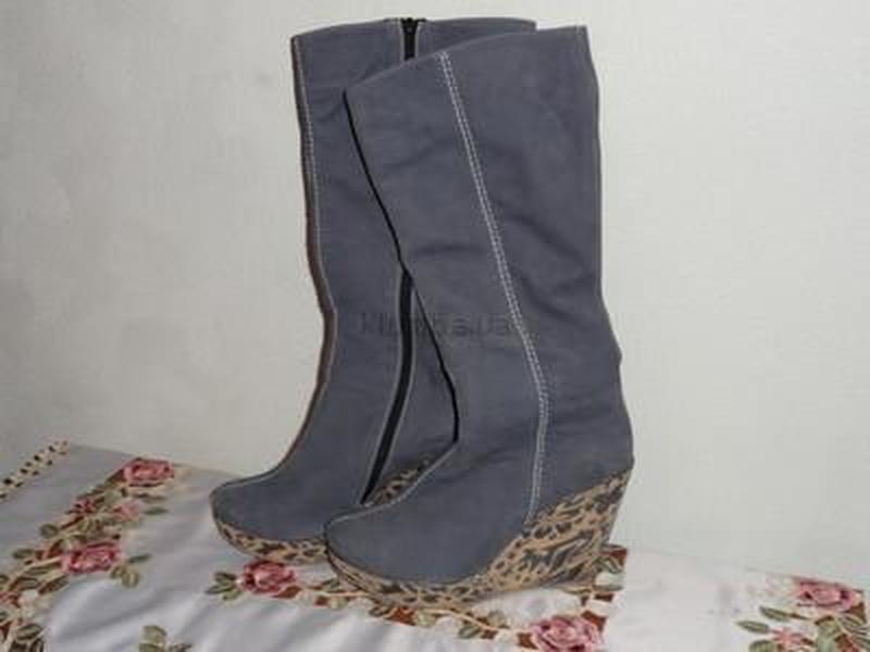Шикарные сапоги демисезонные из натуральной замши. Изготовлены по заказу на украинской-итальянской фирме. Размер указан 40, но реально 38,5. Выглядят на ногах бомбезно. размеры: длина стельки 25 см высота платформы - 11 см, в начале 2 см объем по низу – 30 см высота сапога - 33 см обсяг халяви - 40 см. Купились за 100 долларов США, продаю за полцены.