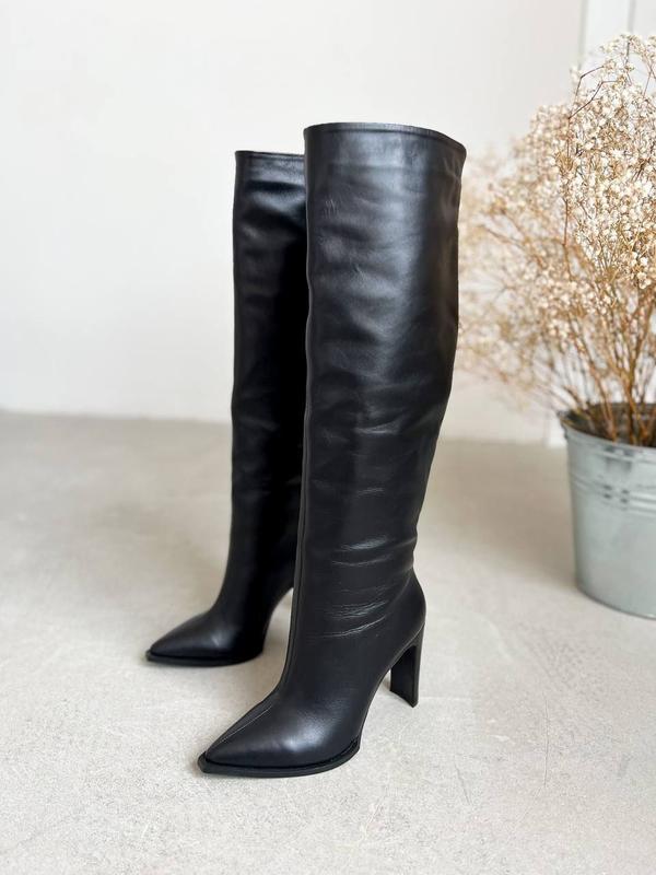 Вау які стильні чоботи труби 😯🥰 Високі шкіряні на замочку Розмірний ряд: 36-40 Висота каблука: 9 см. Висота виробу: 52 см. Ширина халяви: 39 см в 37 розмірі. Кожен наступний +1 см Ширина зверху: Кожен наступний розмір +1см Колір: чорний Матеріал всередині: італійська байка Передоплата 150 грн обмін/ повернення
