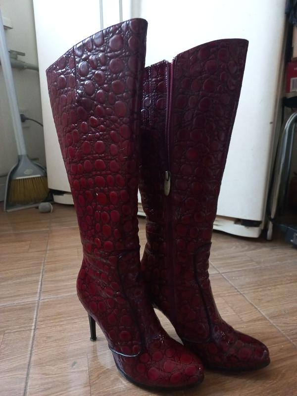 Очень красивые кожаные лаковые рожки сапожки. натуральная кожа снаружи и в середине, размер 36. высота каблука-9,5 см. Очень удобная колодка. Сверла пару раз.