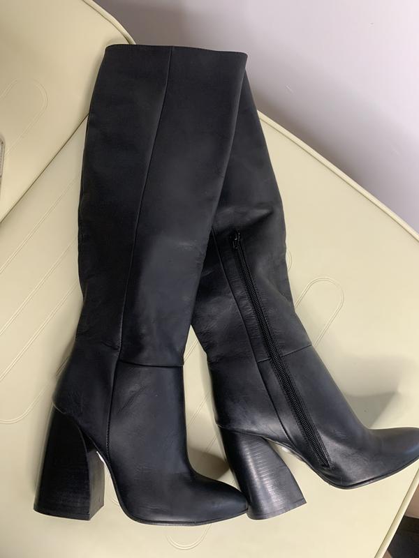 Елегантні шкіряні чобітки, в середині поролон, висота від каблука 43 см, висота каблука10 см, ширина вгорі 18 см по діагоналі.