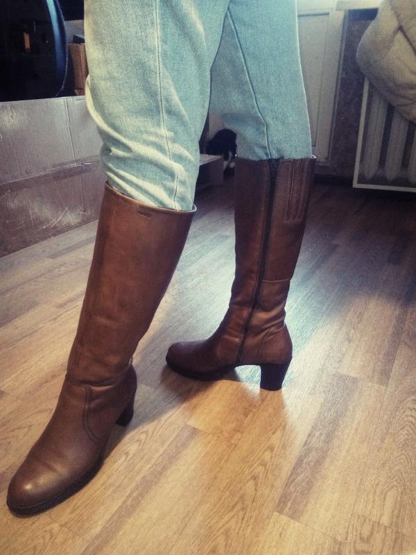 Брендовые утепленные сапоги MARC- Германия. Состояние очень хорошее- без нюансов. Верх из мягчайшей натуральной кожи, внутри- искусственный мех. Цвет шоколадно-коричневый. Подойдут на широкую ногу и полную икру. Указан размер 39. Устойчивый каблук 8 см. Очень удобная колодка. Стелька не съемная- ширина по подошве- 9,5 см Высота голенища- 38 см. Объем голенища- 43 см Сезон носки зима/весна/осень Так как покупать обувь без примерки рискованно, то могу предложить следующее правило - вы можете вернуть товар обратно Новой почтой с оплатой всех услуг по пересылке