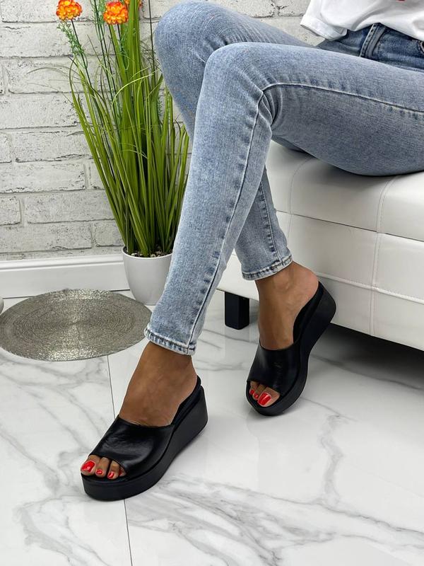 Женские шлепанцы на танкетке/ платформе из натуральной кожи и замши