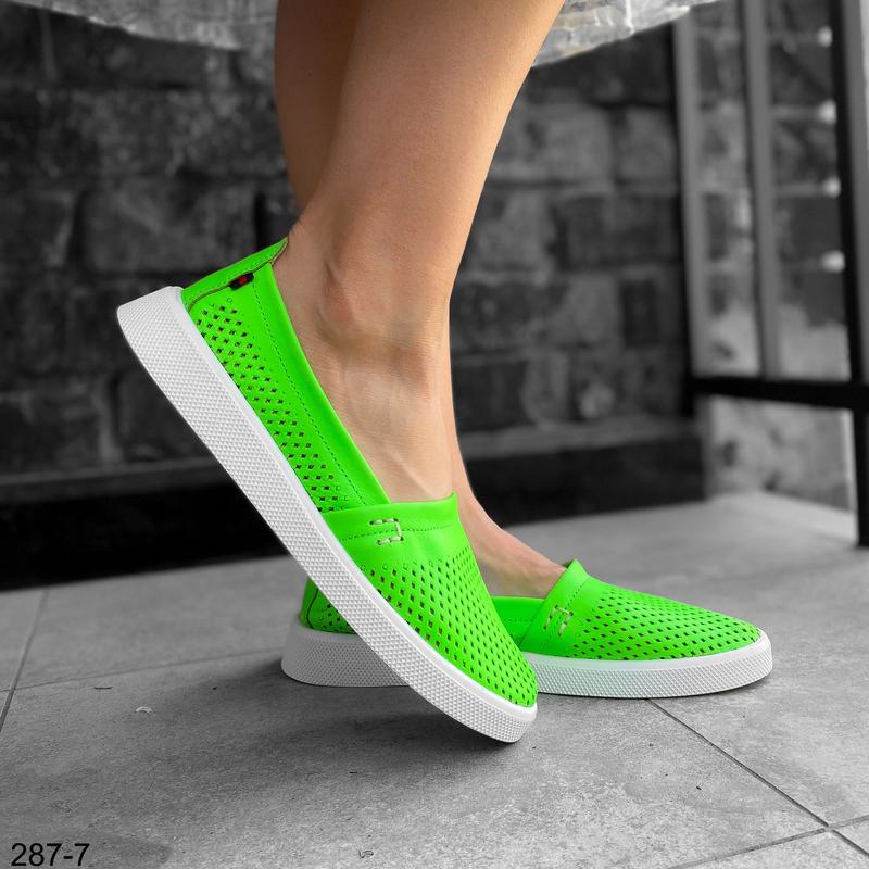 Перфорированные женские кожаные мокасины яркого салатового цвета