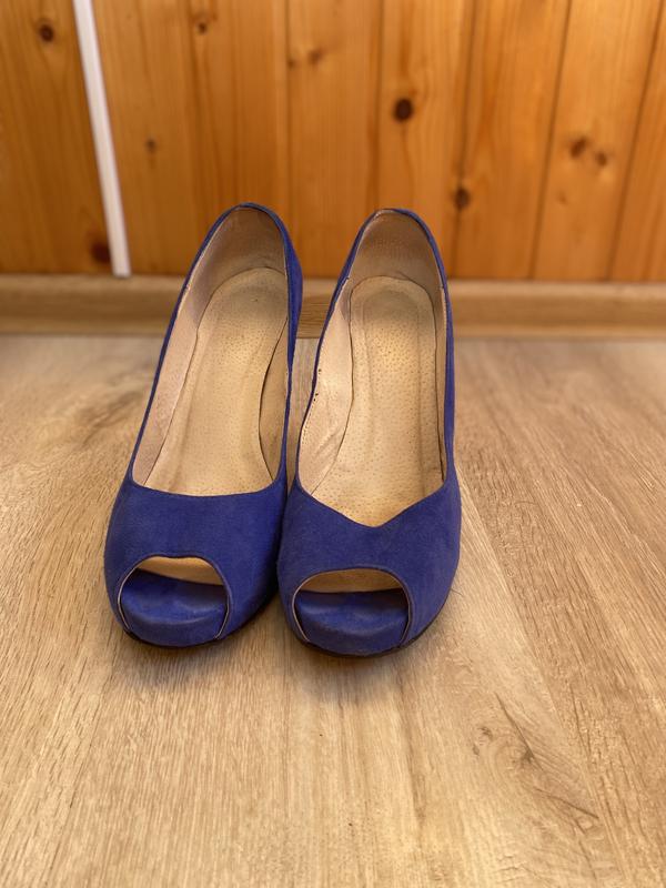 Туфли насыщенного синего цвета, либо приглушенный электрик, каблук 10 см, натуральная замша, подходит на среднюю и широкую ногу, были изготовлены на заказ. Потертости есть только на носке(видно на фото). Длина по стельке 27 см, ширина 10, на подъеме 7