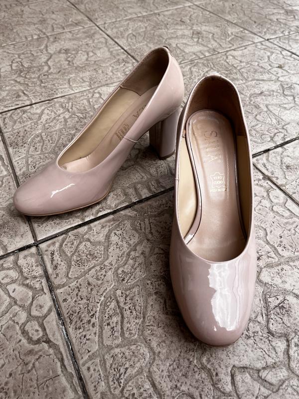 Бежеві лаковані туфлі Sala Collection на стійкому каблуку. Дуже зручні. Розмір 40. Є оригінальна коробка і набойки для зміни. Є дифектик на каблучку (6 фото).