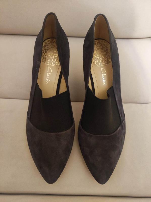 Туфлі Clarks із якісної, натуральної замші сірого кольору,.нові, без дефектів, надзвичайно зручні,дуже гарно виглядають на ніжці, рзмір 37,,довжина устілки 24 см, висота каблука 7 см.