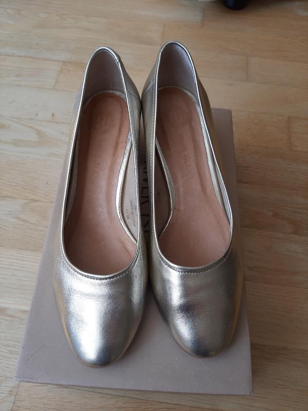 Шикарные туфли в золотом цвете, кожа снаружи и внутри. Очень мягкие, ножке будет удобно, если в размер. Стоили 55 фунтов. Размер 38. Мне оказались впритык, не могу носить, обуты 1 раз. Стелька 24,5. Каблучок 5 см. Дефектов нет никаких! Как новые!