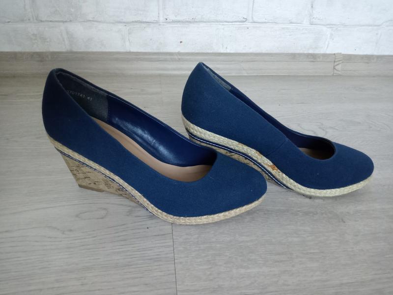Текстильные туфли на каблуке, танкетке '', высота каблука 7 см, длина по по потолке 24 см. Стан новой вещи. Маленький недостаток указан на фото.