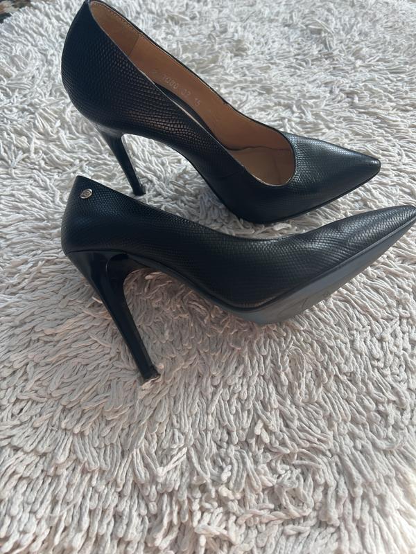 Классические туфли на шпильке, очень отличного качества из натуральной кожи. Длина стельки 23,5, ширина стопы 8 см. Каблук 10 см. Производитель Польша. Подошва темно- синего цвета.