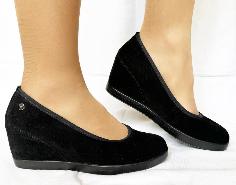 719. Туфли-лодочки на удобной танкетке и платформе датского бренда "Nordic Softness", который принадлежит известной сети "Skoringen" с более чем 200 обувными магазинами в Дании и Норвегии. Изготовлены в Италии Стан идеален без дефектов: чистые стельки без "оттиков", подошва без износа, без посторонних запахов - может, пару раз обуты Актуальная модель Цвет черный Материал верха натуральная замшевая кожа, мягкая и эластичная Кант по верху туфельки из эластичной ленты, чтобы растягиваться на нужную полноту и подъем - ComfortStretch (Комфорт Стрейч) - это специальные эластичные стрейч материалы для верха обуви. Они обеспечивают идеальную посадку каждой модели даже на проблемную ступень Подкладка - натуральная кожа белого цвета с перфорацией для дыхания стопы Стелька съемная, вынимается, натуральная кожа белого цвета с перламутром с мягкой упругой подложкой Размер - 38 указано Стелька - 25 см, ширина - 8 см Полнота – стандартная комфортная, рассчитанные примерно на стопу обхватом в "косточках" (мерять по кругу) 22-23,5 см Каблук-танкетта, высота в пяточной части - 7 см, толщина подошвы в носовой части - 1,6 см, то есть реальная высота каблуков - 5,4 см Способен предоставить дополнительные фото Смотрите другие объявления Лояльные условия покупки: возможный обмен или возврат (оговорка к покупке), более подробно об условиях в разделе "Про меня"
