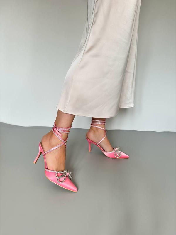Колір : рожевий Матеріал: атлас 36-23 см 37-23,5 см 38-24 см 39-24,5 см 40-25,5 см 41-26 см Каблук : 8,5 см