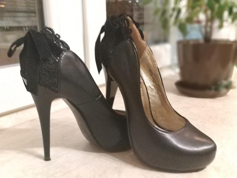 Черные туфельки с высокой шпилькой, утонченно смотрятся на ножке. Украшены сзади кружевом и бархатным бантиком.