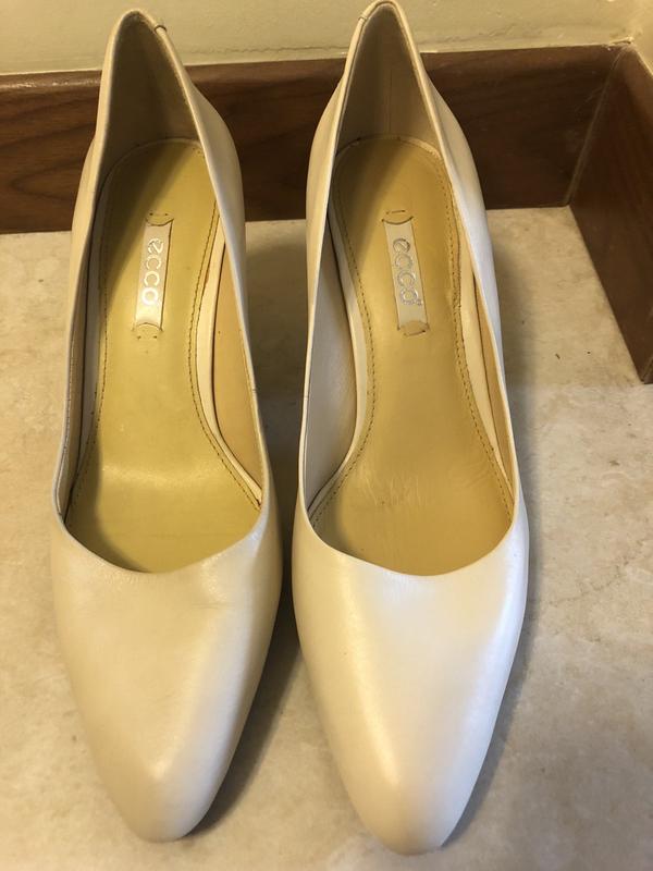 Замечательный туфли известной фирмы ECCO! Очень удобные, каблук средней высоты, цвет светло-бежевый, полностью кожаные. Туфли не носились, но есть небольшие дефекты( показала на фото). Размер 38, длинна стельки 24,5 см., высота каблука 8 см.