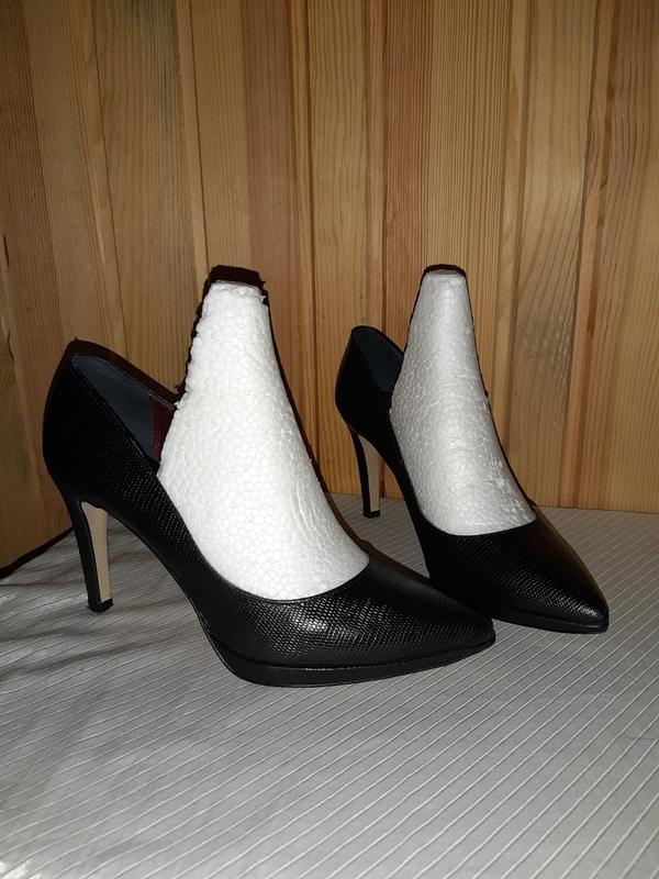 Чёрные кожаные туфли лодочки, с мелким тиснением под рептилию, на высоком каблуке(замер на фото), устойчивые за счёт толстой подошвы под пальчиками. Размер-38, по стельке-25см, идут на ножку 24,5см. Красивая и стильная модель.