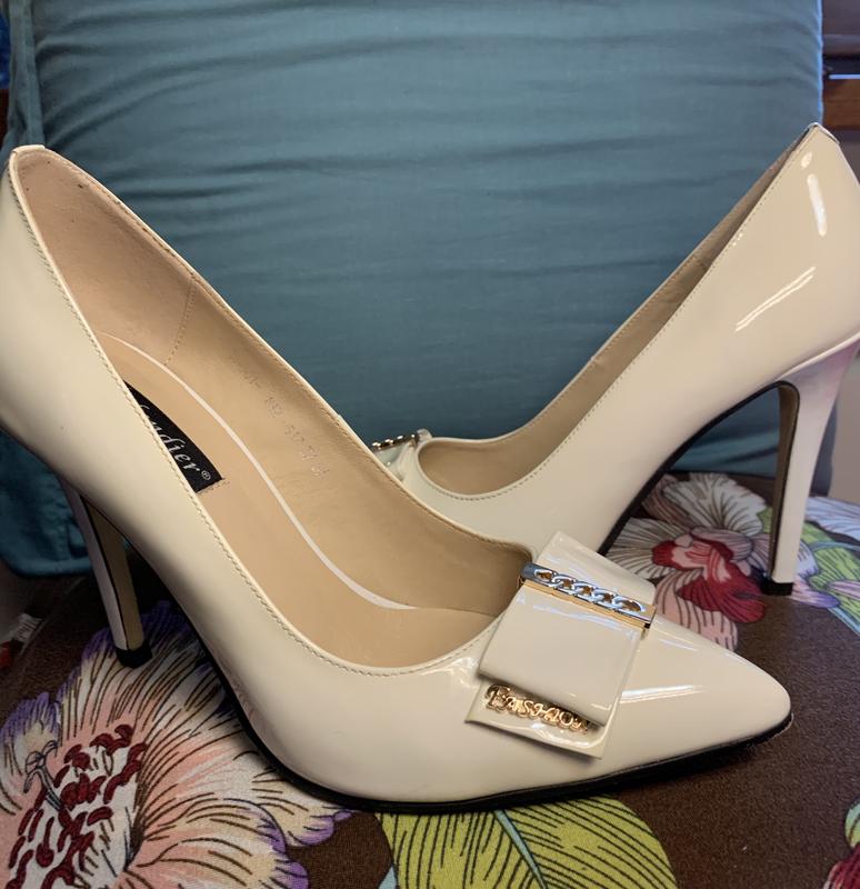 Белые лаковые туфли Kadandier.Очень нежные.Качество туфлей отличное.Ни разу не надевались,но есть два маленьких дефекта на внутренней части туфли{светло розовый развод},практически не видно.Стелька 24,5см. Каблук 10см