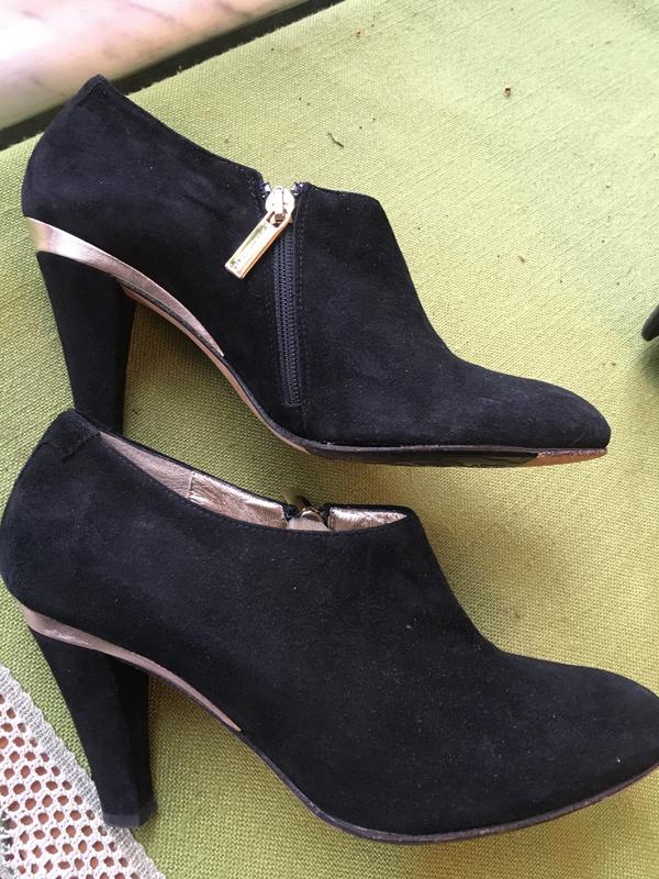 Нарядные Итальянские замшевые ботильоны черные с золотом, покупались в дорогом бутике, полностью натуральная кожа, каблук 7 см, одевались пару раз