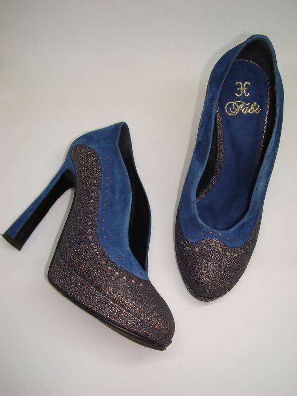 Шикарные женские туфли от Fabi (Италия). Премиум класс! Насыщенный синий цвет! Оригинальное комбинирование замши и текстурированной кожи! Очень удобная колодка! На стельке вышит золотом логотип Fabi. Кожаная подошва с фирменным логотипом. Пыльник с вышитым логотипом Fabi. Состояние - идеальное! Качество - отличное! Состав: 100% натуальная замша + кожа, внутри - кожа, подошва - кожа. Размер в наличии: 37 - длина по стельке 24 см. Высота платформы - 2 см, высота каблука - 11 см.
