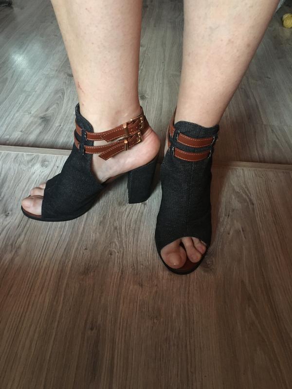 Джинсовые босоножки на высоком каблуке 10 см На ногу средней полноты, полно норный 39 ремешки коричневые( кожзам) Носились пару раз, состояние подошвы на фото, набойки магазина- не менялись