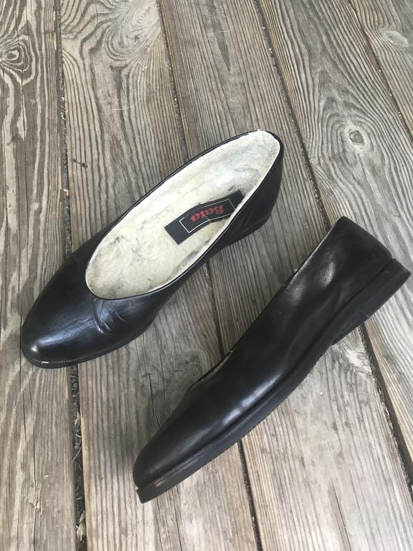 Отличные кожаные туфли от Bata. Внутри-натуральный войлок, туфельки тёплые и очень мягкие, ножки всегда в тепле. Кожа мягкая, подошва нестираемая. Размер указан -39, длина по стельке-24,5 см. Есть следы носки внутри-чуть утоптан мех, но в целом-все ок!