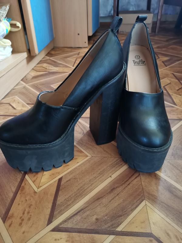 Черные туфли на огромном квадратном каблуке и тракторной подошве бренда truffle Смотря невероятно эффектно ! Внутри не ношеные , подошва новая совсем. Но из-за неправильного хранения есть некоторые внешние дефекты , кое где постирались кусочки поверхности. Никаких поворосочек и ремешков нет ! Могу сказать , что совершенно не влияет на носку. На ножке это все практически незаметно . А так модель супер стильная массивная и крутая . Длина стельки 24.3 см На туфлях указан 39 ор Но по факту - это 38-38.5 , для тех у кого ножка 24 см 24.5 Высота каблука от пятки -15 Высота подошвы -5 см