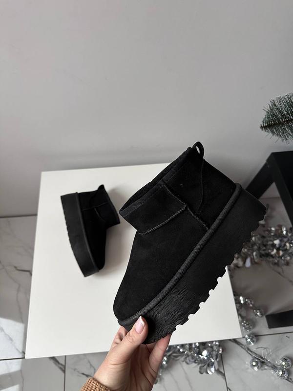 Ультра миники, высокая платформа, без каких-либо эмблем и надписей 💔 Размеры: 36-41 Кольори: кемел, чорний Подошва проризена, легко отмываются, не скользят! На ножках они не тяжелые! Очень мягкий мех 💔 ▫️материал : искусственная замша/ искусственный мех ▫️подошва : 3.5 см