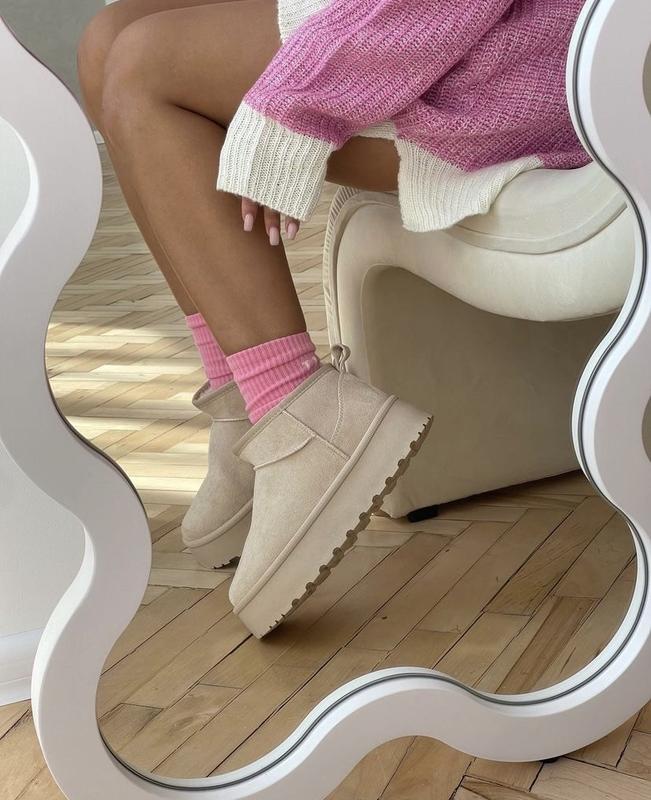 Новая обувь, купила зарисовки для меня, хорошая цена и качество Материал : искусственная замша/ искусственный мех подошва : 3.5 см Ультра мини, высокая платформа, без каких-либо эмблем и надписей Нежный крем. Подошва проризлинена, легко отмываются, не сковзять ! На ножках они не тяжелые! Дуже мʼяке, бите хутро. Спешите утепляться ☺️ Девочки это тренд этой зимой для заказа пиши в Direct