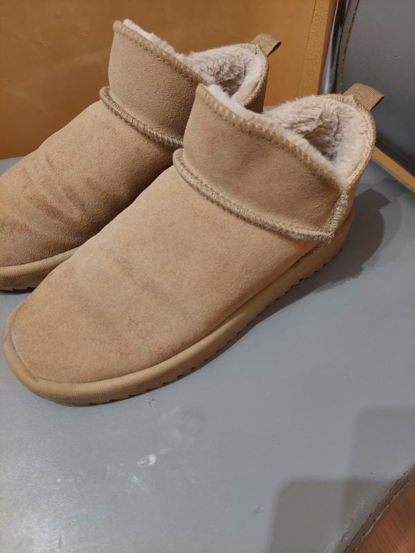 очень теплые угги, бежевого цвета, на низкой танкетке, натуральный замш и мех, производство Польша, красиво сочетаются под леггинсы и белые носки